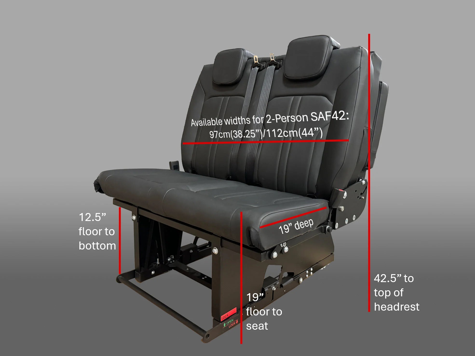 The VanEquipped SafeTrack SAF42 is a versatile 2-seat bed designed for vans, offering multiple reclining positions, a comfortable 74” long bed, and secure child seat anchors. Compatible with SafeTrack Flooring Systems and Seat Mounting Brackets, it ensures safety and convenience for travel and rest.