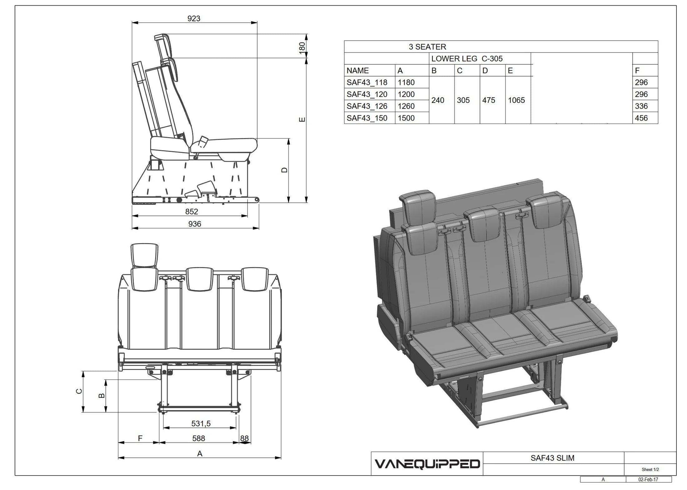 The VanEquipped SafeTrack SAF43 is a versatile 3-seat bed designed for vans, offering multiple reclining positions, a comfortable 74” long bed, and secure child seat anchors. Compatible with SafeTrack Flooring Systems and Seat Mounting Brackets, it ensures safety and convenience for travel and rest.